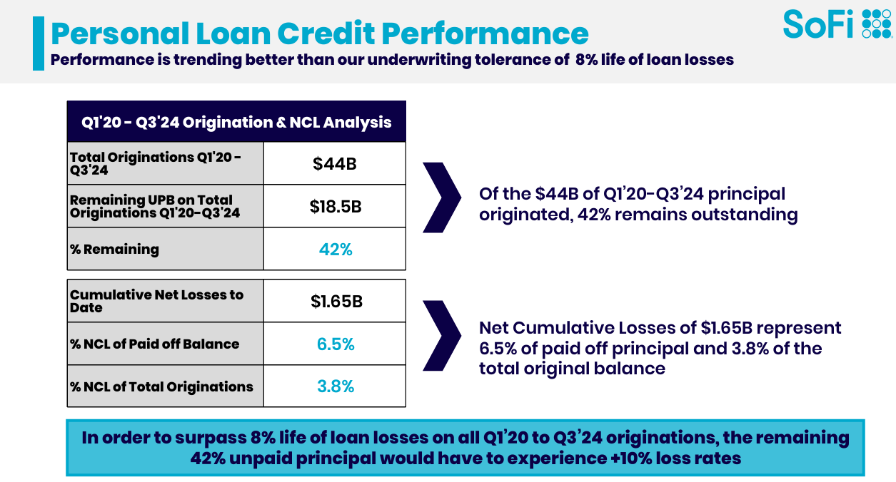 There you go bears. The losses are not just expected—they’re built into the model. What matters is keeping them under control and within planned thresholds, as they are doing with its 8% tolerance. In fact, their performance is better than expected, showing they’re not only meeting their targets but outperforming them. This is a clear sign of strong risk management and profitability, and it’s reassuring for both the company and its investors. This is not a weight on SOFI’s back. Banks aren’t perfect, but they don’t need to be; they just need to be prepared—and that is what they are doing.