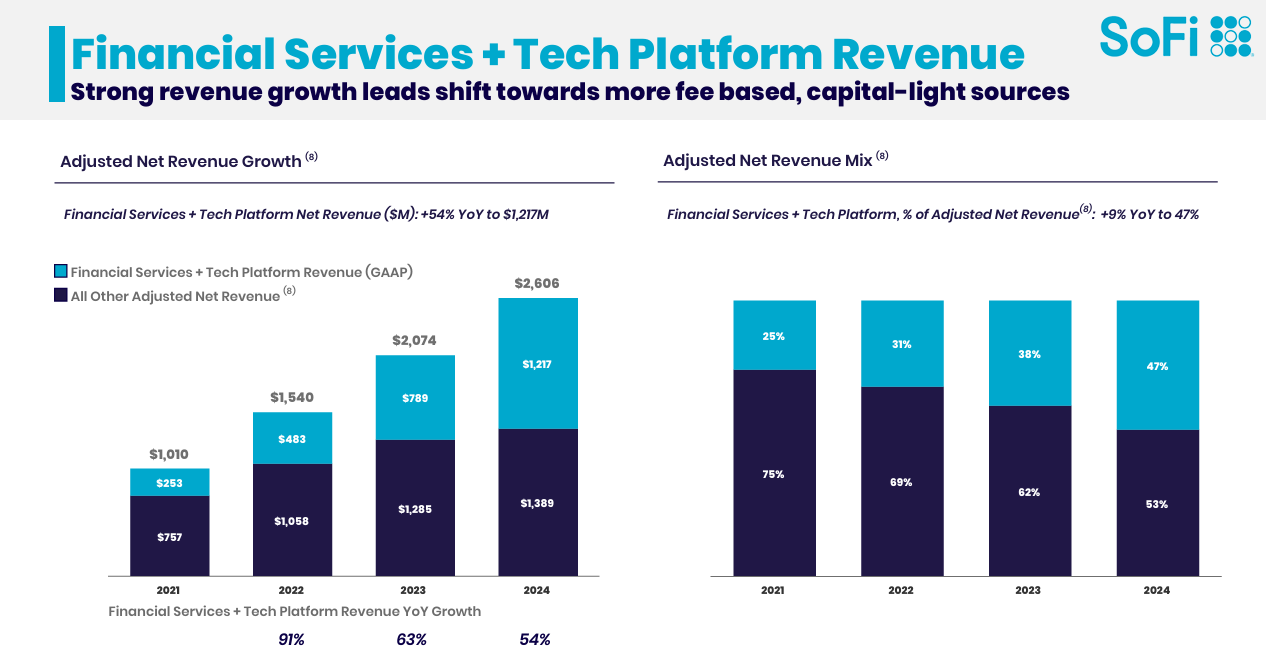 This slide shows SOFI’s transformation as it pivots toward smarter, more sustainable revenue streams. In 2024, the company saw its Financial Services and Tech Platform revenue surge by 54% YoY to hit $1.217B—a massive leap from just $253M in 2021. I think we are forgetting again, how effective Mr. Noto has been at scaling this business. Also, total adj. net revenue climbed to $2.606B, with Financial Services/Tech Platform now playing a bigger role than ever.