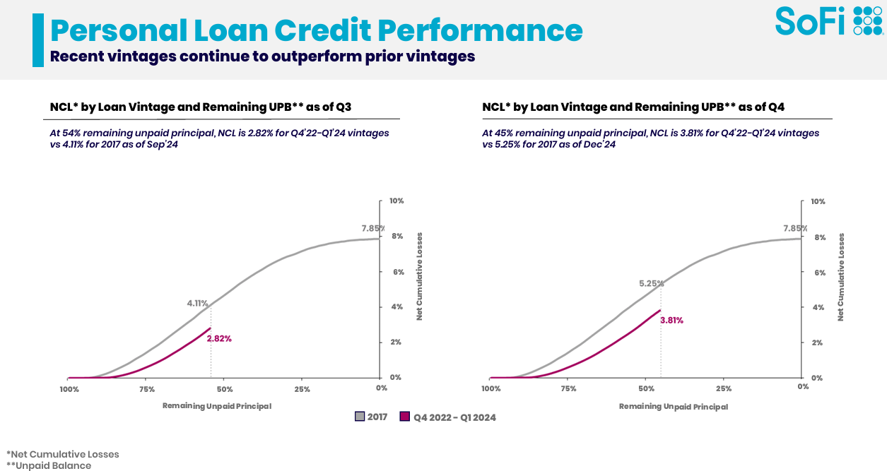 To SOFI’s lending strategy, they have come a long way. This shows their recent personal loan vintages clearly outperforming older ones. It’s a testament to how the company is getting smarter and more efficient in managing credit risk. When you compare loans issued in 2017 to those issued between Q4 2022 and Q1 2024, the difference is notable. By Q3 2024, the newer loans had a net cumulative loss (NCL) of just 2.82%, while the 2017 loans were at 4.11% at the same point in their lifecycle. Fast forward to Q4 2024, and the gap grows even wider—recent loans showed a 3.81% NCL with 45% of unpaid principal remaining, compared to 5.25% for the 2017 cohort.